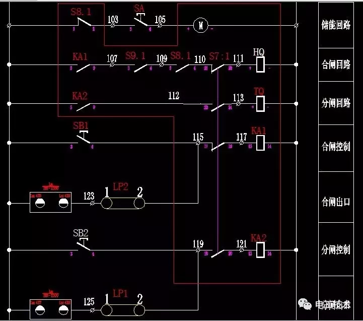 所以在該圖上按下合閘按鈕SB1,首先繼電器KA1會得電吸合,吸合后合閘回路KA1常開觸點會變常閉狀態,如果確認下門已關好,隔離開關處于合閘狀態,接地開關處于分閘狀態,電機已儲能。此時合閘線圈得電工作,觸動開關合閘機構位置,開關合閘。所以我們在合不上閘的情況下,首先要判斷所有的輔助觸點狀態(即接地開關狀態、隔離開關狀態、電機儲能狀態、下門關閉狀態)由硬件設施到回去狀態去解決,相必會事半功倍。