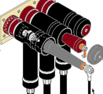 通過一個裝有接地排和觸頭的小門翻開時,設(shè)備試驗套管進行耐壓試驗;試驗結(jié)束后,關(guān)上門,主動試驗短接及接地。該方案簡單,避免了拆開作業(yè),通過小門與開關(guān)之間的機械聯(lián)鎖保證小門只需關(guān)閉到位后,開關(guān)才華被分閘到阻隔方位。且該方案斷開間隔更大,阻隔耐壓水平更高。