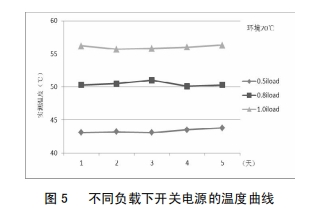 改良后,為考證改良效果,對(duì)開(kāi)關(guān)電源分別在0.5倍、0.8倍及1.0倍負(fù)載下停止了為期5天的帶負(fù)荷實(shí)驗(yàn),圖5為不同負(fù)載下開(kāi)關(guān)電源的溫度曲線,由圖5可知,隨著負(fù)荷的增大,開(kāi)關(guān)電源問(wèn)題總體呈上升趨向;負(fù)載不變的狀況下,同一溫度曲線根本堅(jiān)持平滑;開(kāi)關(guān)電源在額定負(fù)載下運(yùn)轉(zhuǎn),最高溫度不超越57℃,未達(dá)報(bào)警值,開(kāi)關(guān)電源牢靠性得到顯著進(jìn)步。