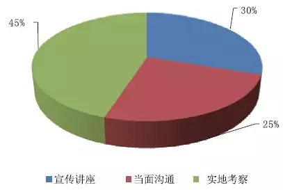 通過了解參加者了解新產品知識的途徑,以為最有用的方法中:宣傳講座的占比30%;能夠通過當面溝通的占比25%;能夠參加實地考察的占比45%。如圖16所示。