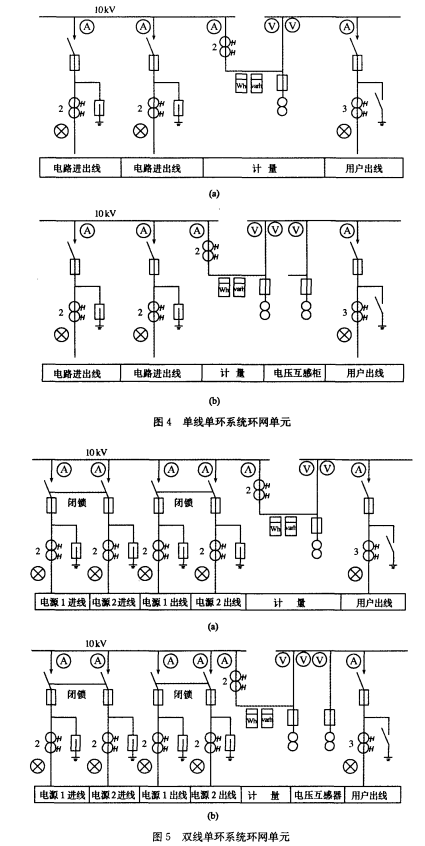 環式配電體系中的用電單位配電體系接線(環網單元)的電源進出線柜不設保護設備,見圖4~6.放射式或樹干式配電體系的用電單位終端配電所,進出柜應設保護設備。