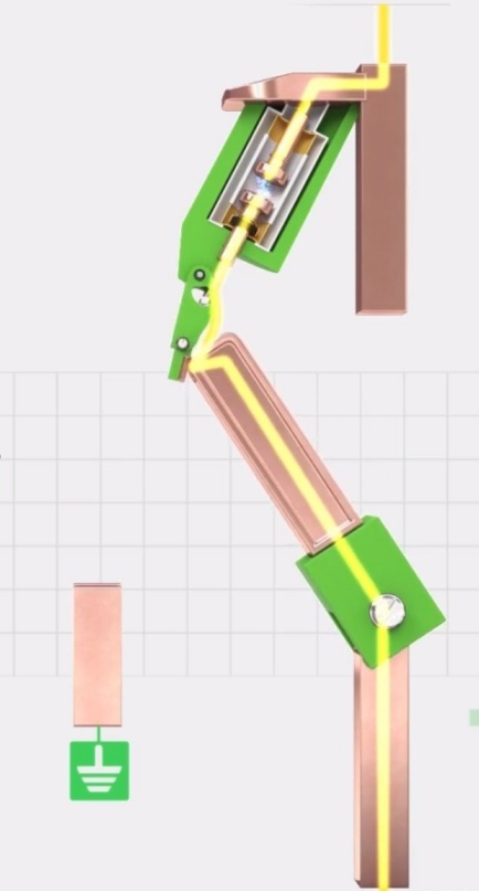 然后,電流通過處于閉合位置的真空滅弧室。接下來,在動觸頭的推動下,樞軸桿旋轉并驅使真空滅弧室開斷。