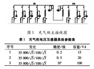 變電站位于高原地區,海拔2100m。變電站選用某公司出產的35kV中壓充氣柜。主接線如圖1所示,其間電壓互感器型號為JDZx-35(A、B、C)型,具體參數如表1。